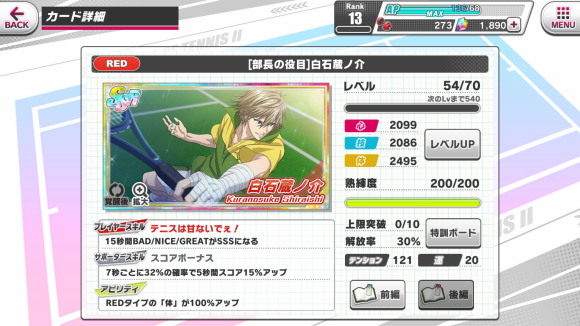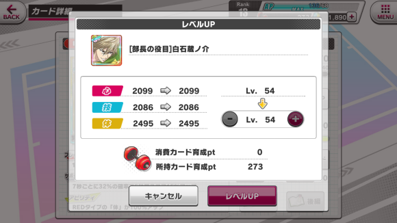 レベルup:使用上方的卡牌育成pt提升卡牌等级【卡牌等级≠角色等级】