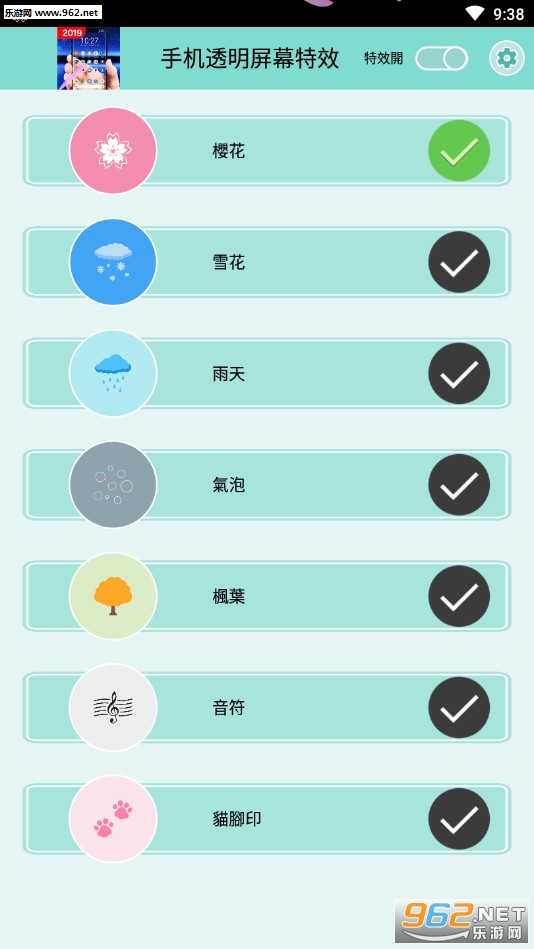 软件只有几兆,不用担心占用多大的内存,使用也简单,想要什么特效就选什么特效,有着樱花、雪花、雨天、气泡、枫叶等众多不同的选项,喜欢的朋友可以下载试试。
