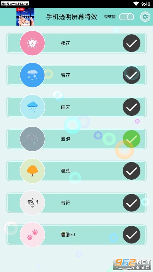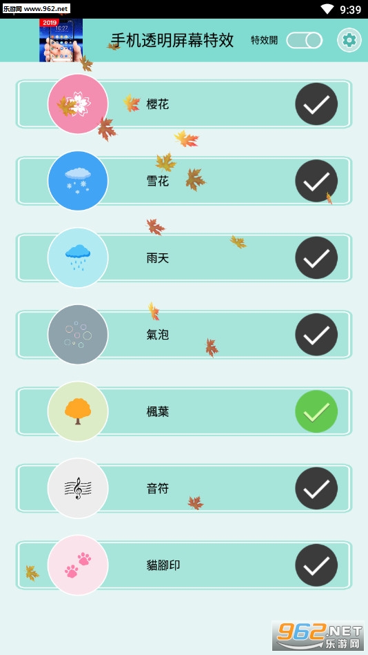 《手机透明屏幕特效软件》是一款为朋友们打造的手机桌面特效软件,手机使我们常使用的工具,每个人的手机上都会用上自己喜欢的壁纸,本款软件可以在已有的壁纸上加入一些透明的特效,比如不断落下樱花、枫叶、雨水等,还有着可爱的猫爪印、气泡等。