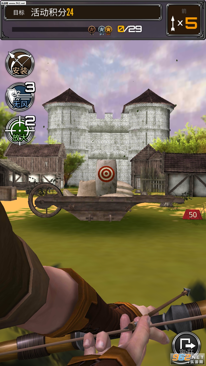 游戏中玩家需要考虑重力、风向等影响,拉动弓箭后便开始计时,必须快速准确地射击。