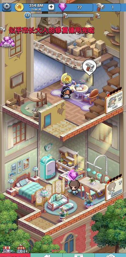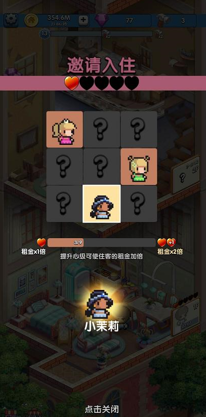 通过游戏升级获得酒店的装修次数,为酒店房间选择合适的地板、壁纸、桌子和床铺,再邀请客人入住。通过收取住宿费为街道赢取更多的资金。