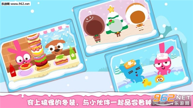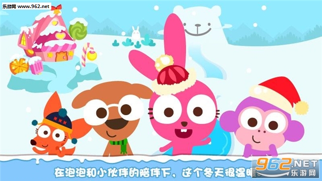 以冬日乐园为场景,宝宝可以控制泡泡兔参加各种活动,更有隐藏的动画等你发现哦!