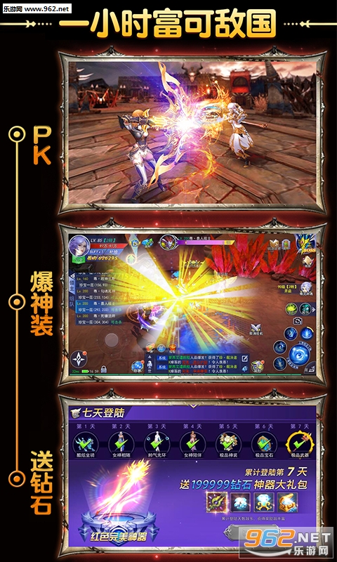 2、上线送永久VIP9,绑定钻石*38888,boss掉装,自由交易闷声发大财!