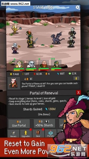 即使你不玩游戏,你总是获得金币!这是空闲游戏的一个关键特征。当你回到游戏中时,获得你所有的线下黄金并让你的英雄升级一吨。现在,您可以轻松完成下一组关卡。在您第一次使用续订门户后,您甚至可以在离线时获得舞台进展。