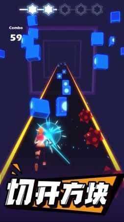 伴随着动感的音乐,长按屏幕左右移动游戏中的小人,使用小人手中的光剑切开飞驰而来的方块!同时要注意躲开所有障碍哦~