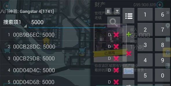 3、打开八门神器搜索你购买的房产的收入金额,例如5000,搜索类型选择DWORD