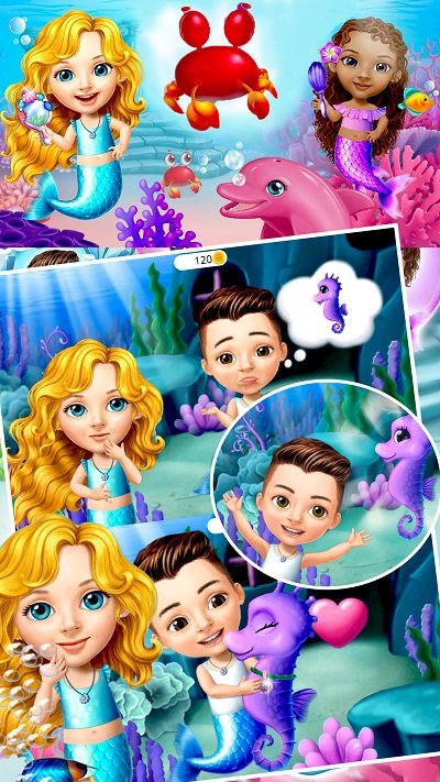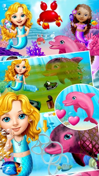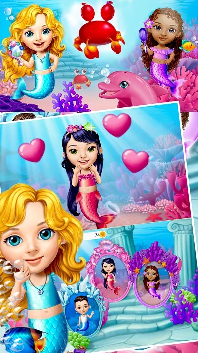 潜入神奇的海底世界,了解可爱和友好的美人鱼的秘密生活!探索海洋,并与可爱的海豚,外来鱼类,螃蟹和其他海洋生物一起玩有趣的美人鱼化妆!