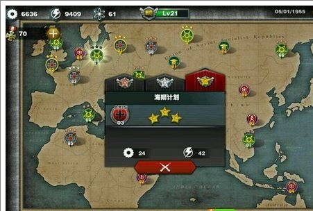 征服只有一张地图(即世界地图),但提供了4个年份,所以,你可以理解为4张征服地图。地图的解锁是按照时间的,达到一个年份,解锁一个年份的征服地图。不同年份的征服地图,地图一模一样,只是国家、阵营、国家版图发生变化。每张征服地图的可选国家,分1/2/3星三种难度。每个难度的国家,第一次获胜会获得大量升级资源和勋章,难度越大,奖励越多。但是,同一难度的国家,只有第一次获胜奖励工业、能源、科技和勋章,以后再胜利,只奖励工业和能源,科技和勋章不再奖励。