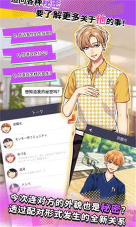 玩家可以通过各种APP和不同的陌生男子交流,究竟你的性格和谁更加相配呢,新的秘密短信即将为你揭开,各种性格不同的花样美少年都在这里,不管是喜欢霸道总裁还是小鲜肉,或者是眼镜学长风在这里都能够有机会和他们近距离的接触,非常拟真的交流方式,让你们从加好友开始,拓展到朋友圈接触,逐渐能够走进对方的生活,了解对方的一切,让你开始一段甜蜜的浪漫故事。
