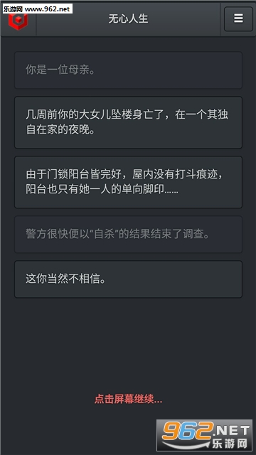 《无心人生安卓版》这是一款文字类的剧情解谜手游。玩家需要搜寻可疑物品,选择不同的分支选项,推动故事剧情的发展,最终解开女儿的自杀真相。游戏上手容易,感兴趣的玩家可以下载体验!