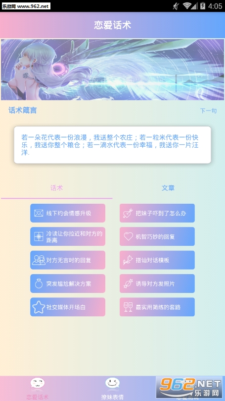 恋爱三脚猫是一款专门为宅男设计的恋爱指南软件,不会和女生聊天?不知道怎么接女生的话?不知道女生是否对自己有意思?不知道如何表达自己的新意?没关系,来这里就对了,这里有各种唯美的恋爱物语,还有一些恋爱技巧传授,更有各种撩妹表情包,宅男们还等啥,再不学就找不到女朋友了。