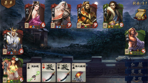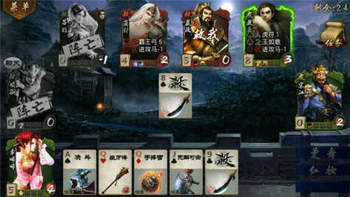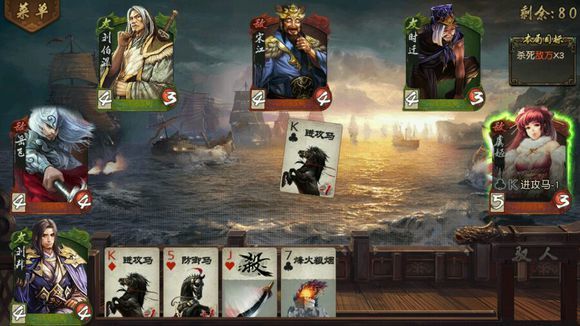 另外的一些出牌技巧:宋江最爱狼牙棍,把其他手牌都发掉然后留个杀,一棍打三个;对付没牌的刘伯温可以送他一张废牌然后群P之;对付宋江最好是等他手牌发光了就群P之,一人一刀够喝一壶。任桓之的话随时可以拼点当釜底抽薪,特别是对方只剩一张牌的时候,很多时候对方手里拿的就是救命稻草,被生生弄走还不能无懈;花木兰最爱博浪锤,对方一闪可立马扔装备,一堆手牌马上到手;用扁鹊优先自救,血多一滴就能拿多一张手牌才多一分希望;用鲁智深掉一滴血健康掉两滴血发狂掉三滴血暴走,不要太怕掉血,但记得尽量要留一张无懈在手(防被牢);陈圆圆对付空牌刘伯温可以另让一个男性人物先出杀与之比武;李师师受伤害要转队友,时迁可以偷作为队友的花木兰的装备,当然了偷东西先偷对方的梅花的装备。赵飞燕出完牌后留黑色杀,这样的话既可当杀也可当闪,能保存实力;韩信攻心的话,如果对方是出了各种手牌最后来攻心的话猜方块,因为往往对方手里只剩下闪了,闪里面多数是方块,反之用韩信的话建议拿牌的时候就攻心,当然不要在手里有好牌的时候这么干。韩信还是勾践、刘伯温的克星,攻心在关键的时候往往作用非凡。