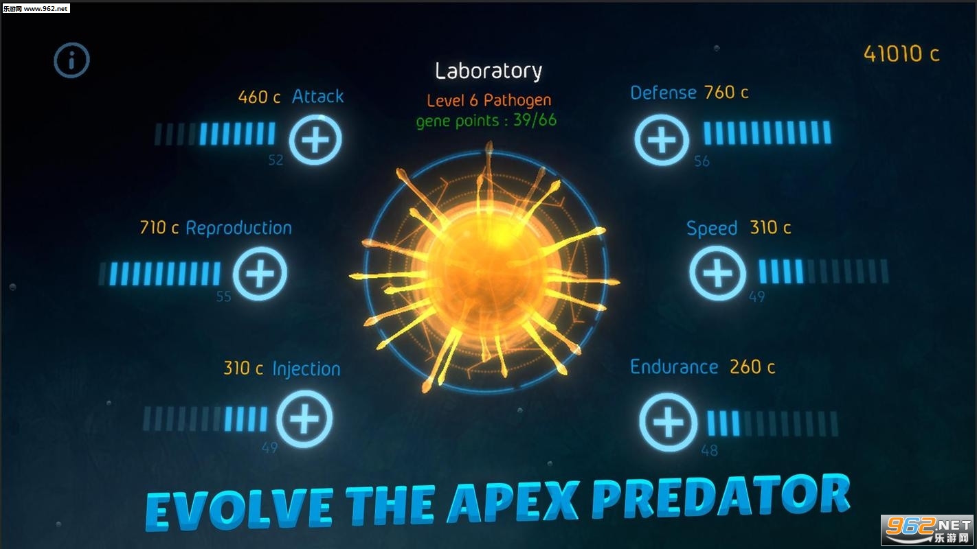 滑动选中一个或者多个你方病毒,移动到敌方病毒或大宿主身上,与其他微生物战斗,占领所有领地即胜利,最终发展为最高级的物种。整个过程也需要动脑筋思考,需要与游戏AI做斗争,在关卡结束之后强化细菌来增加竞争力,不能只顾着侵蚀,还得保护好自己的细菌,确保不被其他细菌侵蚀。游戏的操作也非常简单,手指触屏点击选中自己的细菌,然后想要侵蚀哪个细胞,点击即可。