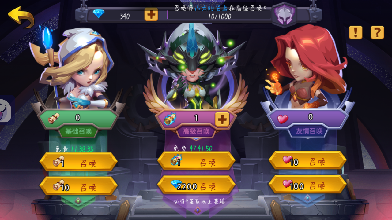 1.初级召唤可获得基础品质英雄,通过培养提升星级,挑战不同关卡层数还能获取大量奖励!