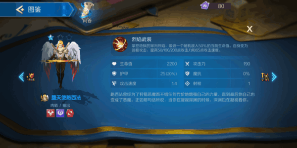 堕天使路西法的技能烈焰武装可以吸取敌人50%的生命值让自己变成远程攻击,并提高攻击力和攻击速度,从技能上看路西法的技能十分强力,无论对方血量多高直接就给减去一半,远程输出的话伤害也是高的确有作为核心的潜质。