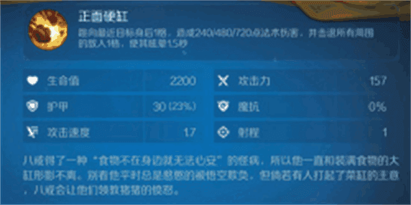 天蓬元帅的外观是一个背着酒坛的小猪,显得异常可爱和娇小。小小的身体里却隐藏着蕴藏着大大的能量,如此娇小的它技能名叫正面硬刚”(跳向最近目标身后1格,造成240/480/720点法术伤害,并击退所有周围的敌人1格,使其眩晕1.5秒。),这招范围性的控制效果往往可以打乱对方阵型并暂停对面的输出,效果不错。