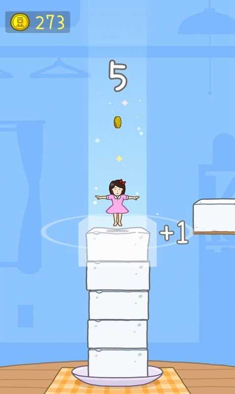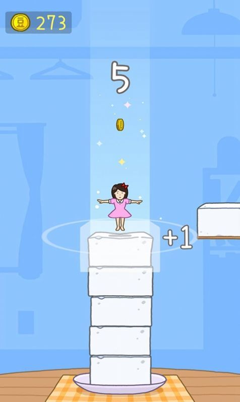 1、抓住豆腐出现的最佳时机,让女孩稳稳落在豆腐中心,努力将豆腐塔堆得更高。