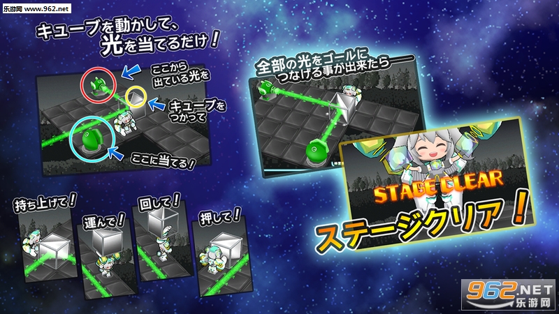 玩家将扮演机器人少女,搬运砖块,让光带转移到特定位置通关!以此来复兴各大星球