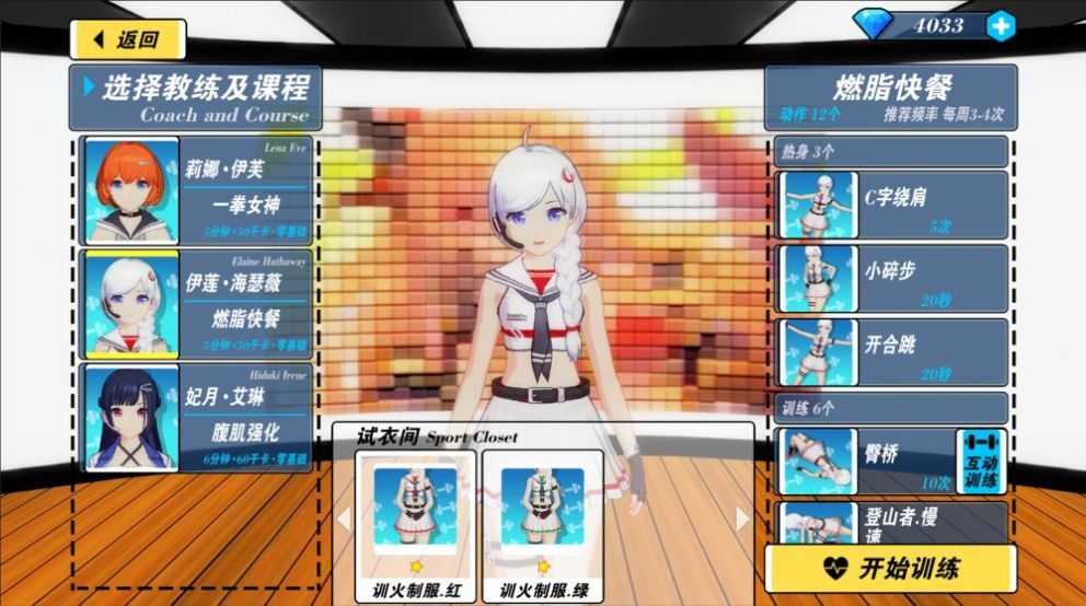 老婆养成:游戏中玩家可以通过完成健身任务来进行角色养成,解锁不同的教练、服装和动作