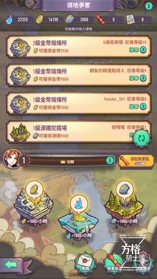 这听起来有点野蛮,但在这神秘的艾尔大陆上,你的武力与蛮横霸道,才是确保骑士团高枕无忧的一大关键!每个骑士团都可在此领域拥有自己的领地,并藉以生产资源,指挥官须在此摆放巨像和守卫组成防守阵容。别人可以觊觎你的领地资源,而你也能对其他骑士团进行无情地掠夺!