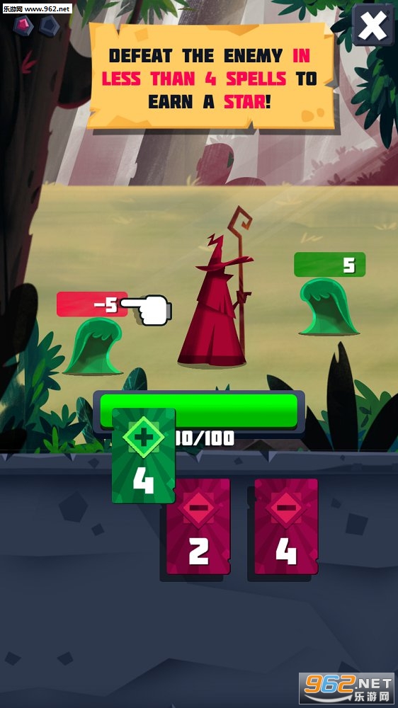 《算术魔法安卓版》小编温酒认为这可真是一款十分诡异的游戏。一天,一个红袍红帽子魔法师来到了森林里,遇到了很多奇怪的怪物,这些怪物头像不断冒着各种数值,魔法师则需要从手牌中抽出相应的数字将其消除掉。