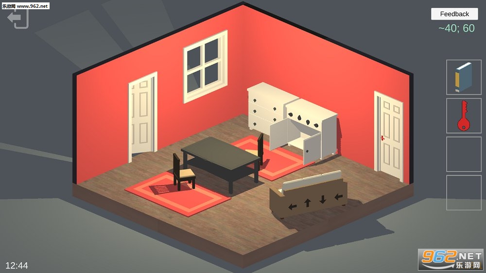 左右滑动可以切换视角,有些关键线索就藏在背后,所以要善于利用,比如第一个红房子里,在沙发背后有四个箭头,记住他们的方向,然后把柜子上的四个水滴状标志调成一样的方向就能打开了,里面有一把红色的钥匙。下面一个房间的床底下有一把遥控器,可以打开电视上的机关。