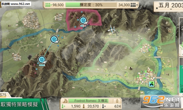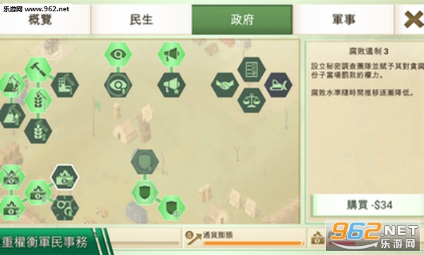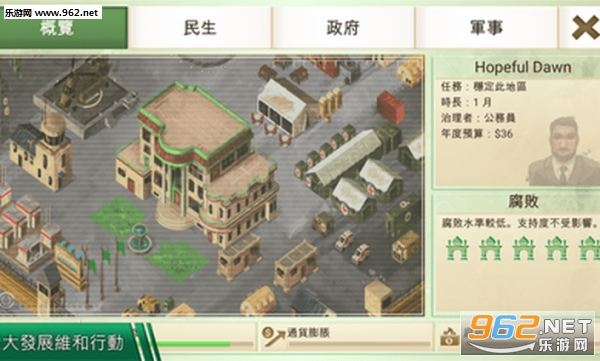 进入游戏之后,你的军队需要驻扎在当地并且不断壮大实力,操作菜单分为概览、平民、政府和军队四个选择,你需要获得资金保证政府运作,修建水电、医疗、交通、通讯等基础设施提高经济发展水平和当地人支持率,同时要预防腐败以免祸起萧墙。
