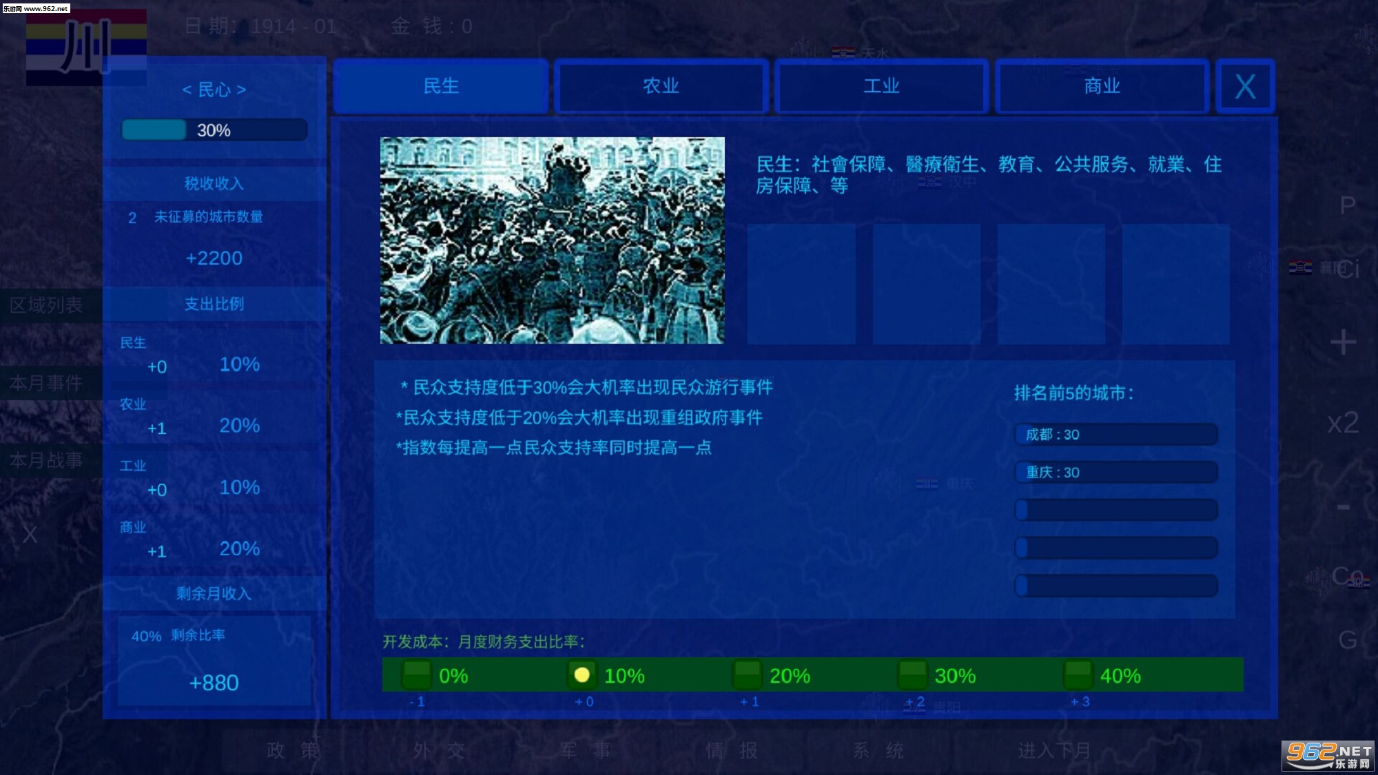 这款游戏并不完美,但它很有创意的在战争游戏中加入了民生这个影响因素,你的很多政策执行都会去影响到这一点,而大力发展科技也是至关重要的,这也进一步提现了经济的重要性,当然最重要的还是战略问题了,快去一统天下吧!