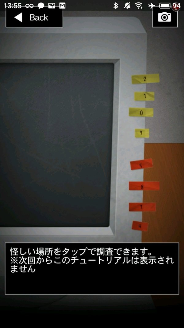 之后,前往有红色长凳的房间,进入左侧房间,在灰色桌子前拿到另一半【钥匙碎片】。在道具栏中合并两个碎片。使用合成后的钥匙打开最上方的门,调查电脑以获取密码。根据之前红色长凳房间的线索(黄色O表示保留,赤色X表示忽略),按照电脑上黄色纸条从短到长的顺序排列,得出密码【7102】,用此密码开门。
