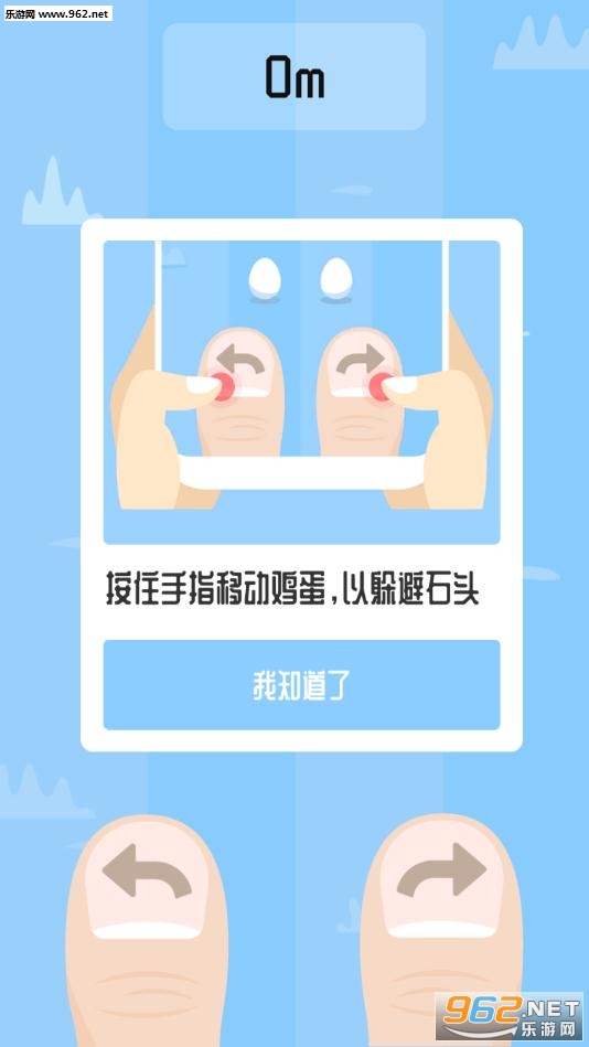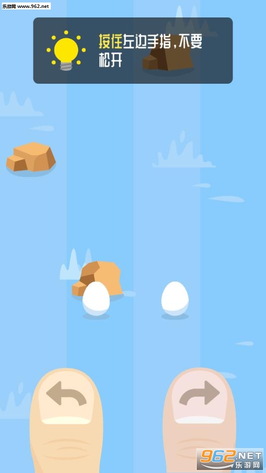 用双手大拇指按住屏幕下方的两个手指移动鸡蛋,以躲避石头,通过松开和按住手指来控制蛋蛋。 冲刺极限,一起来挑战最高分吧!