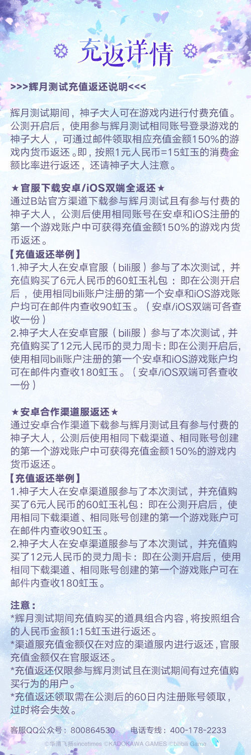 公测开启后,使用参与辉月测试相同账号登录游戏的神子大人,可通过邮件领取相应充值金额150%的游戏内货币返还。