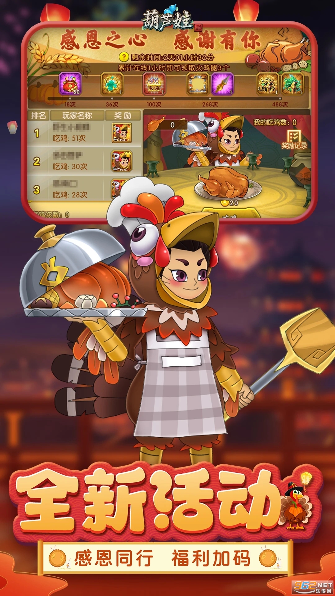 1、新增活动-感恩之心:玩家可免费获得“火鸡腿”,参与活动可获得“感恩同行”皮肤与各类稀有道具。