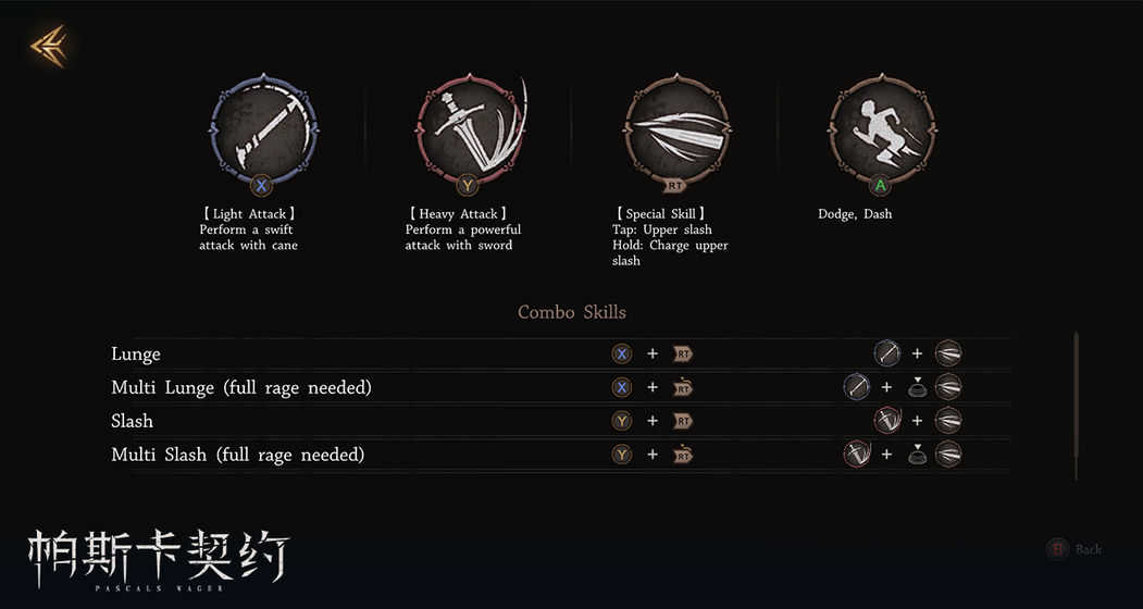 泰伦斯:在试玩版中泰伦斯的武器是手杖和剑,轻击是用手杖攻击,重击是用剑攻击。轻击和重击都可以最多连续攻击3次。防御(长按)可以抵挡部分伤害。而防御键也可以用来弹反。闪避系统按一下是垫步,快速按两次翻滚闪避。轻击中按重击是轻战技(需怒气30%),长按重击ex轻战技(满怒)重战技和ex重战技同理。