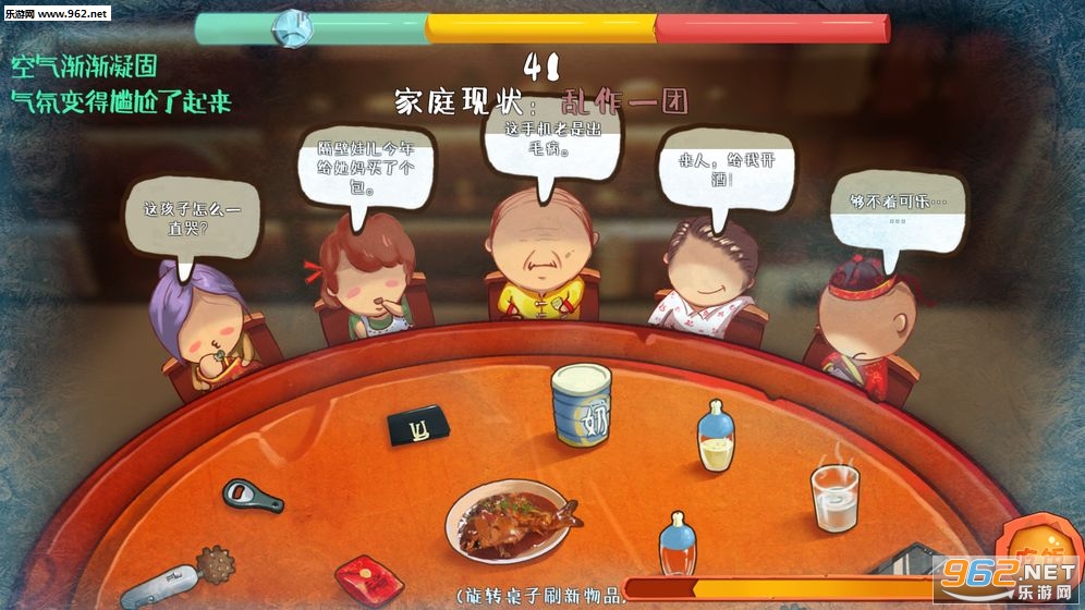 《家宴游戏官方版》是一款剧情向的休闲手游,非常喜庆的游戏画面,玩家在游戏中需要时刻调节家宴上的气氛,保证满足大家的需求,让大家都更加开心,让家宴能够持续的更久。游戏的设定很有新意,喜欢的玩家们可千万不要错过哦!