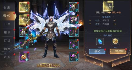 在装备强化界面,可对角色穿戴的装备进行强化,装备强化可提供额外基础属性加成。装备强化需要消耗强化石和金币,其中强化石可通过分解绿色、蓝色和紫色品质的装备,也可以通过强化石资源副本获得,在更换装备时,强化等级和属性会自动继承到新装备上。