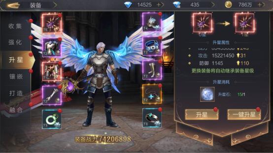 在装备升星界面,可对角色穿戴的装备进行升星,每次装备升星都会提供巨量的基础属性和附加属性加成,其中强化等级也会影响升星的加成。装备升星需要消耗升星石,其中升星石可通过分解橙色品质的装备获得,在更换装备时,星级和属性也会自动继承到新装备上。