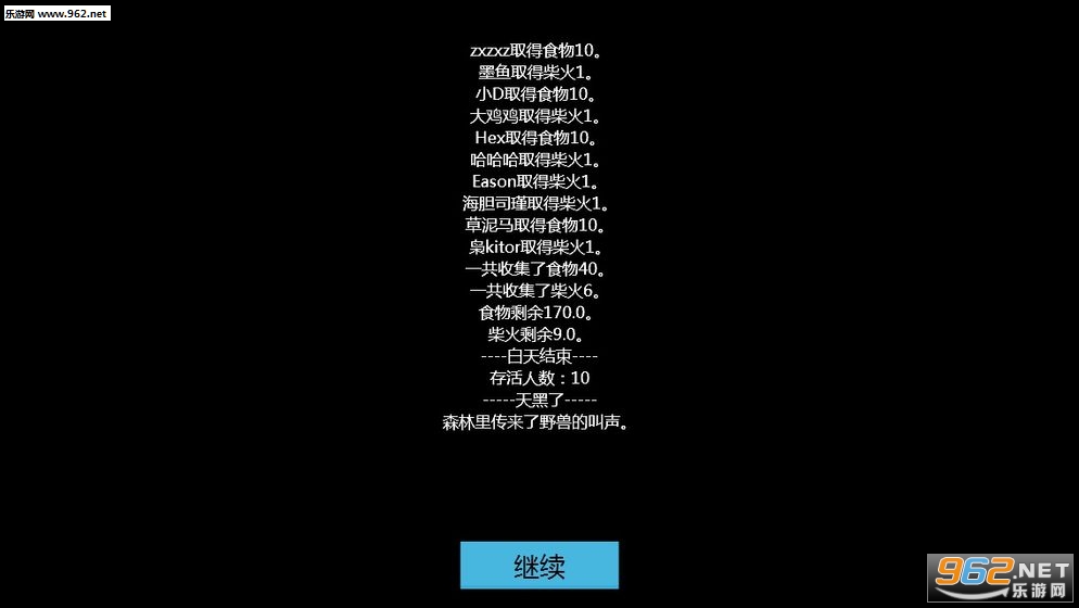游戏分为白天和夜晚,白天大家各自配合谋生(打猎、砍柴)。晚上可以偷偷藏起食物,也可以冒着生命危险去收集资源。