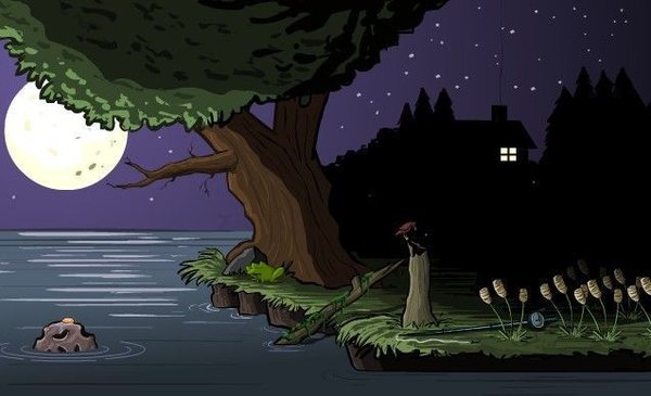 第1关:点击大树上的树枝使其掉落,接着再次点击树枝让虫子出现;等虫子爬到青蛙面前时点击青蛙;随后点树上的鸟洞,再点击鸟之前停留过的树桩,之后点击鱼竿;最后点击最初掉落的陨石,再点虫子,然后连续三次点击鱼竿即可通关。