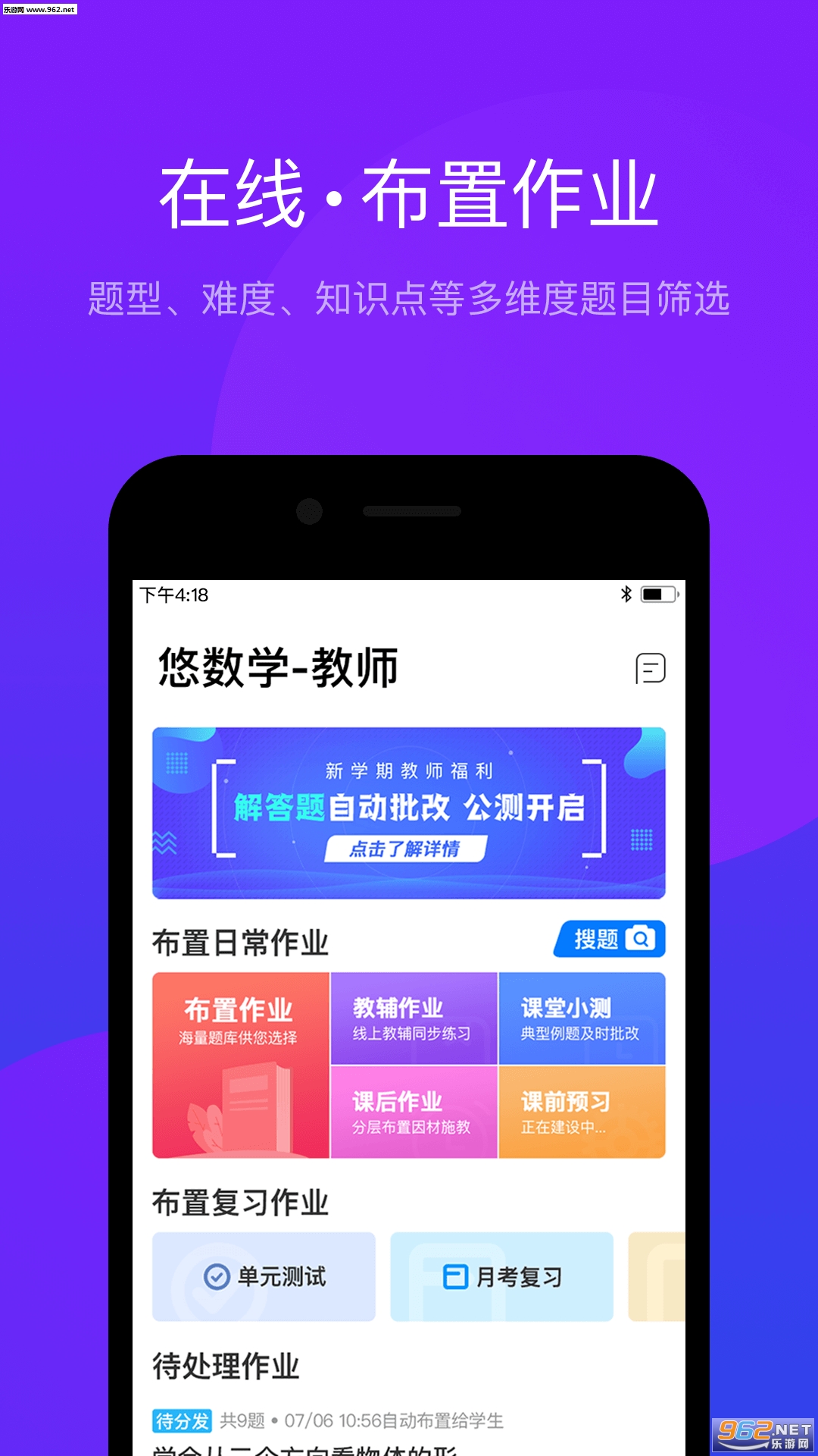 3.作业自动批改 悠数学会为您自动批改大部分的作业,学生提交即可查看成绩,解放老师的劳动力