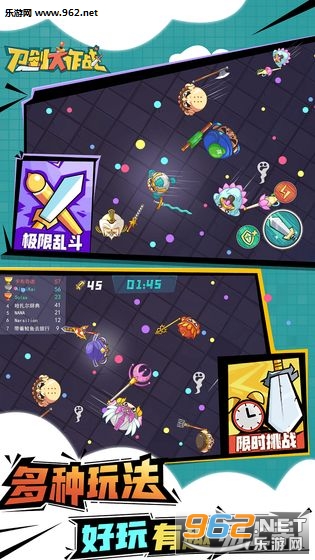 《刀剑大作战》是一款卡通风格的休闲io对战手游。游戏中有超多超萌的角色可以解锁和收集,还有极限乱斗和限时挑战两种玩法模式,玩家需要在有限的时间内尽可能多地利用武器击杀敌人,同时还要吃掉经验球哦~玩法非常有趣!