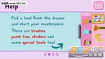 你可以直接在画布上画画或选择背景或人物来涂颜色。小猪佩奇和乔治会不时弹出来看看你画得怎么样。完成绘图后,你可以在小猪佩奇学校里举办自己的画展!