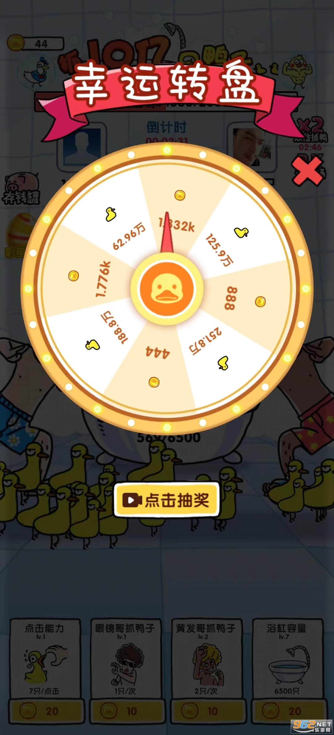2、开始游戏后,下方消耗金币还可升级点击能力,制定人员抓鸭,以及扩大浴缸容量