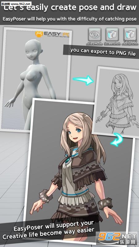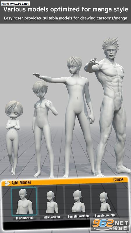 常规虚拟人体app的8头身比例模特在漫画、游戏、插画等领域并不常用。Easy Poser 提供了实用性更强的6头身(多种体型)男、女人体模特。[3头身Q版人体模特准备中。]