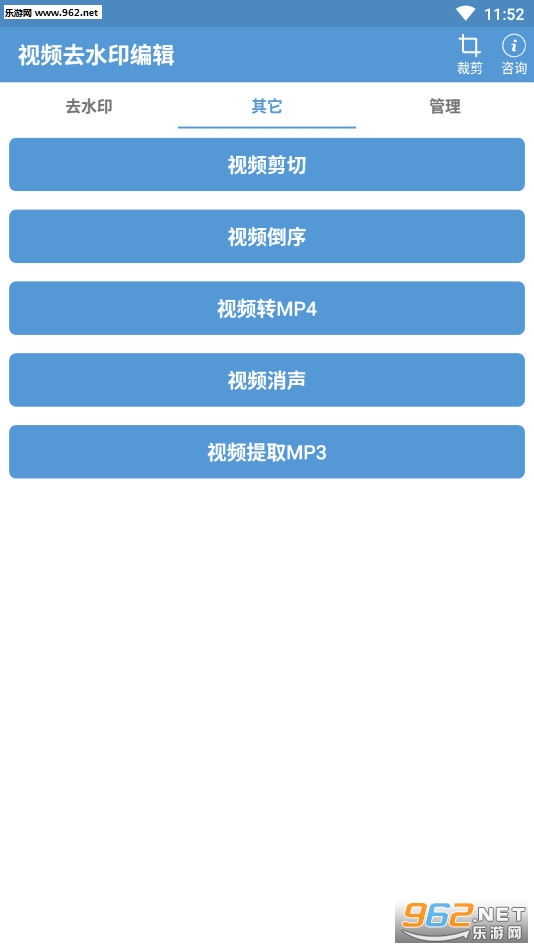 视频处理特性:支持视频去水印、视频裁剪、视频剪切、视频倒序、视频提取MP3、视频转MP4、视频消声