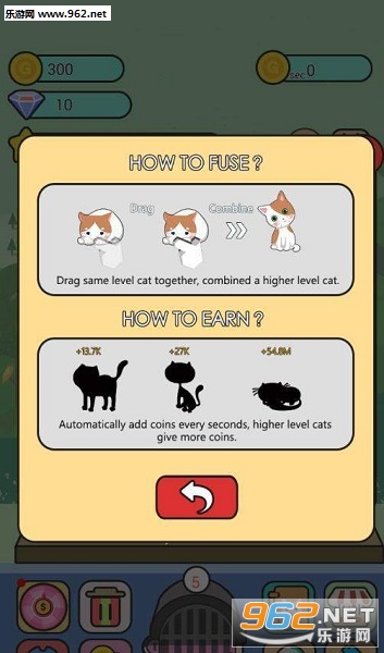 点击屏幕上的小笼子,释放你的猫。把两只相同的猫放在一起,产生一只新的猫。