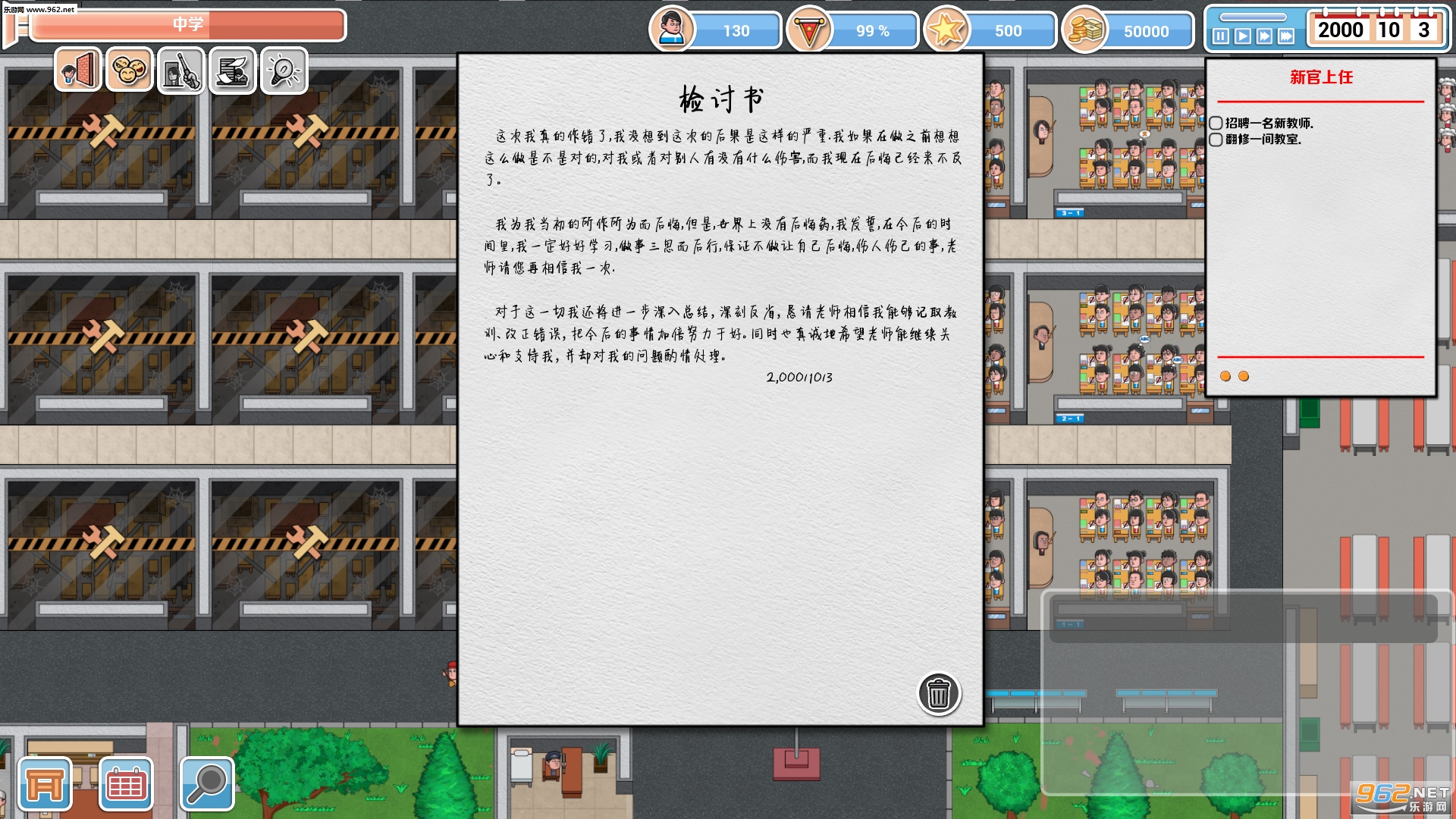 惩罚:为了提升成绩,你必须用各种来阻止违规行为在学生之间扩散。为此你可以选择包括罚站,跑圈,写检查,甚至是记过和退学的处分方式去惩罚违反校规的学生。