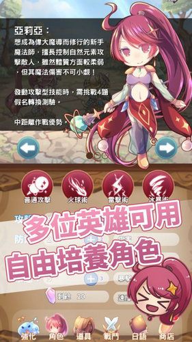 玩家可操控三位英雄,在试炼森林中挑战魔物与老板,