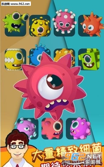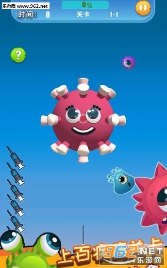 病毒求生大作战是一款很治愈系的游戏,这款游戏中有很多奇怪的水果的形状,并且游戏中有大量的萌细菌,玩家在这里需要将细菌消灭,你需要一定数量的药剂才能够彻底将细菌消灭,还不能碰到细菌的防御区,欢迎来到Dr.AA研究院,让我们一起学习水果细菌治疗知识,在Dr.AA带领大家用各种各样的针筒消灭这些奇形怪状的水果萌细菌。