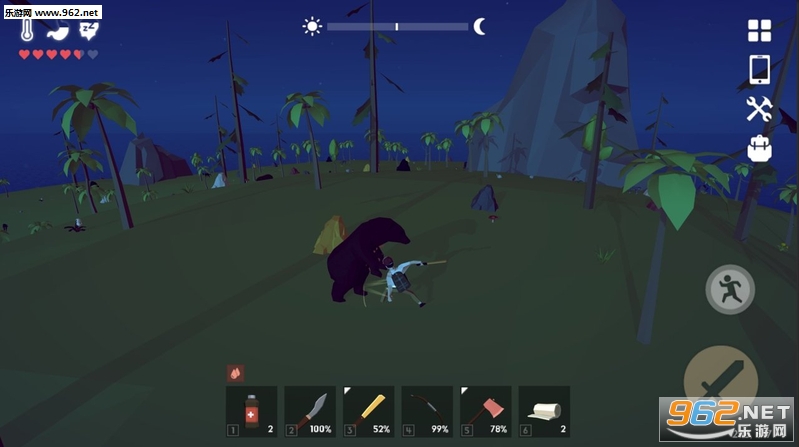 6、真实的昼夜交替和天气变化系统,除了能够探索荒岛之外,还能够建造小船在海面狩猎。