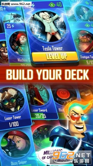 Tower Duel中有数十种塔防和攻击单位卡 - 收集它们,升级它们,制作最适合你的塔防策略的套牌!由于数百万卡升级组合,没有两个卡片组是相同的。从未有过如此深刻的战略游戏玩法被包含在短暂的游戏时间电子竞技比赛中。